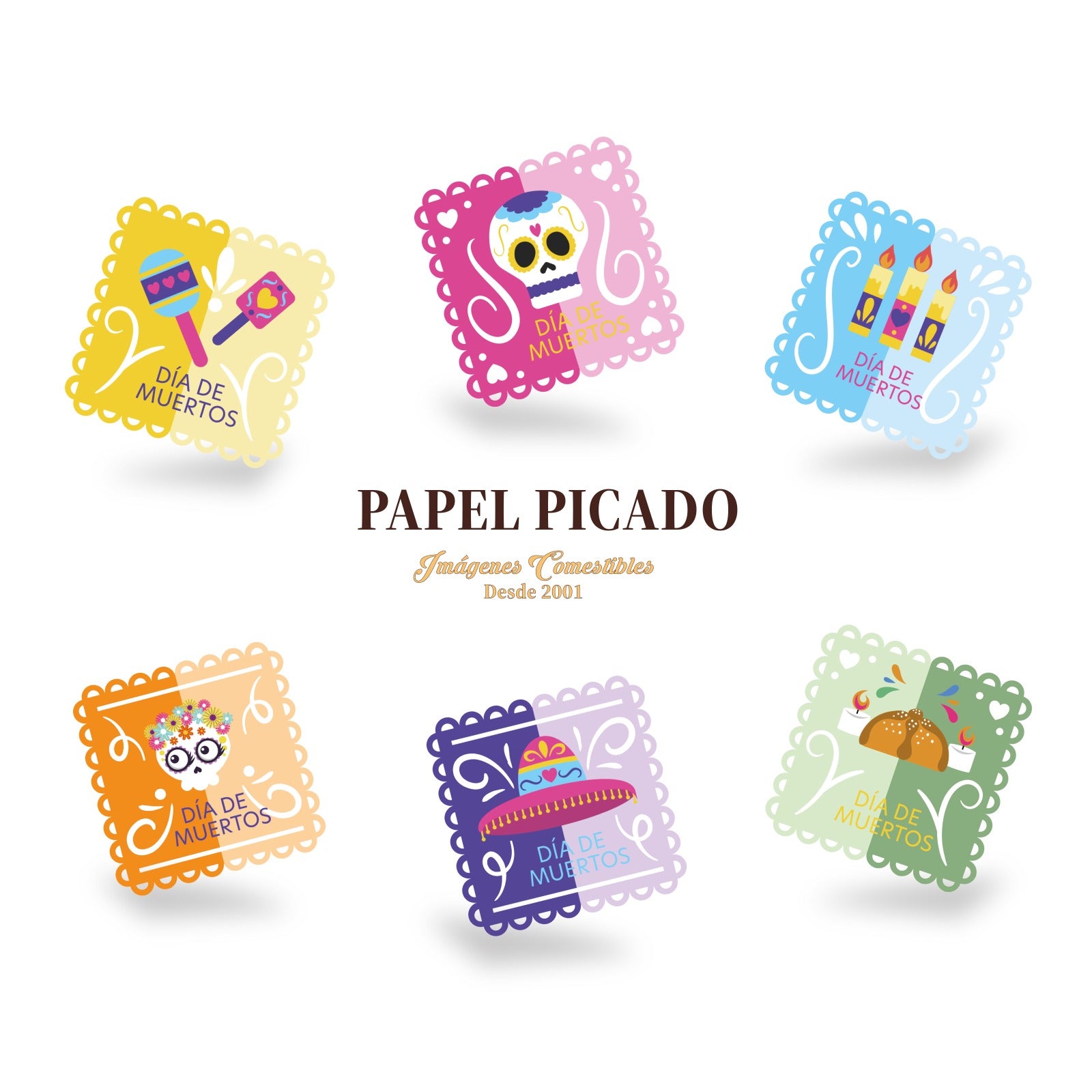 Cada bolsa incluye 6 piezas de 7 x 7 cm, elaboradas conpapel y tinta 100% comestibles, concertificación Kosher y permiso FDA.